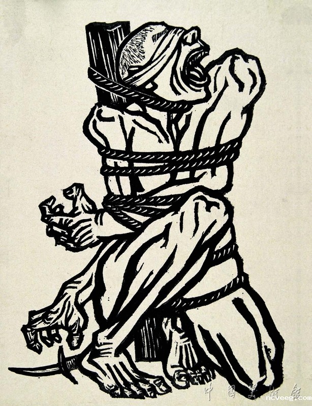 《怒吼吧,中国》作于30年代全民族反帝救亡热潮中。这件作品采用象征手法,以一个被紧紧捆绑、双眼被蒙蔽的痛苦而屈辱的男人躯体,预示一个民族终要起而怒吼和抗争的忍无可忍的选择。从这件作品中,不仅可以看到作者结实明快的画风和苦心经营的处理,也可以看出他在木刻民族化上的努力。作品有强烈的视觉冲击力,是30年代新兴木刻的力作之一。