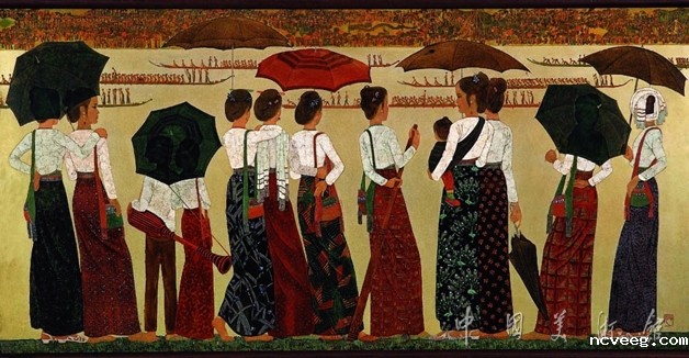 乔十光的作品注重漆性与绘画性的统一,使得现代漆画在保持传统文化品格的同时不断创新,逐步走向独立。《泼水节》是他的代表作。此画构图独具匠心,画家将身着节日盛装的傣家女子疏落有致的背影展示于前景,河中的龙舟竟渡与对岸沸腾的人群作为背景,烘托出热烈的节日气氛。丰富的工艺手法体现了画家对漆性的纯熟驾驭,他用蛋壳镶嵌表现白色的上衣,绚丽多彩的裙子则结合了银箔罩漆研磨法以及螺钿镶嵌技法,泥银彩绘的水面也为绮丽的人物提供了最好的背景。全画雍容华贵,精美典雅。
